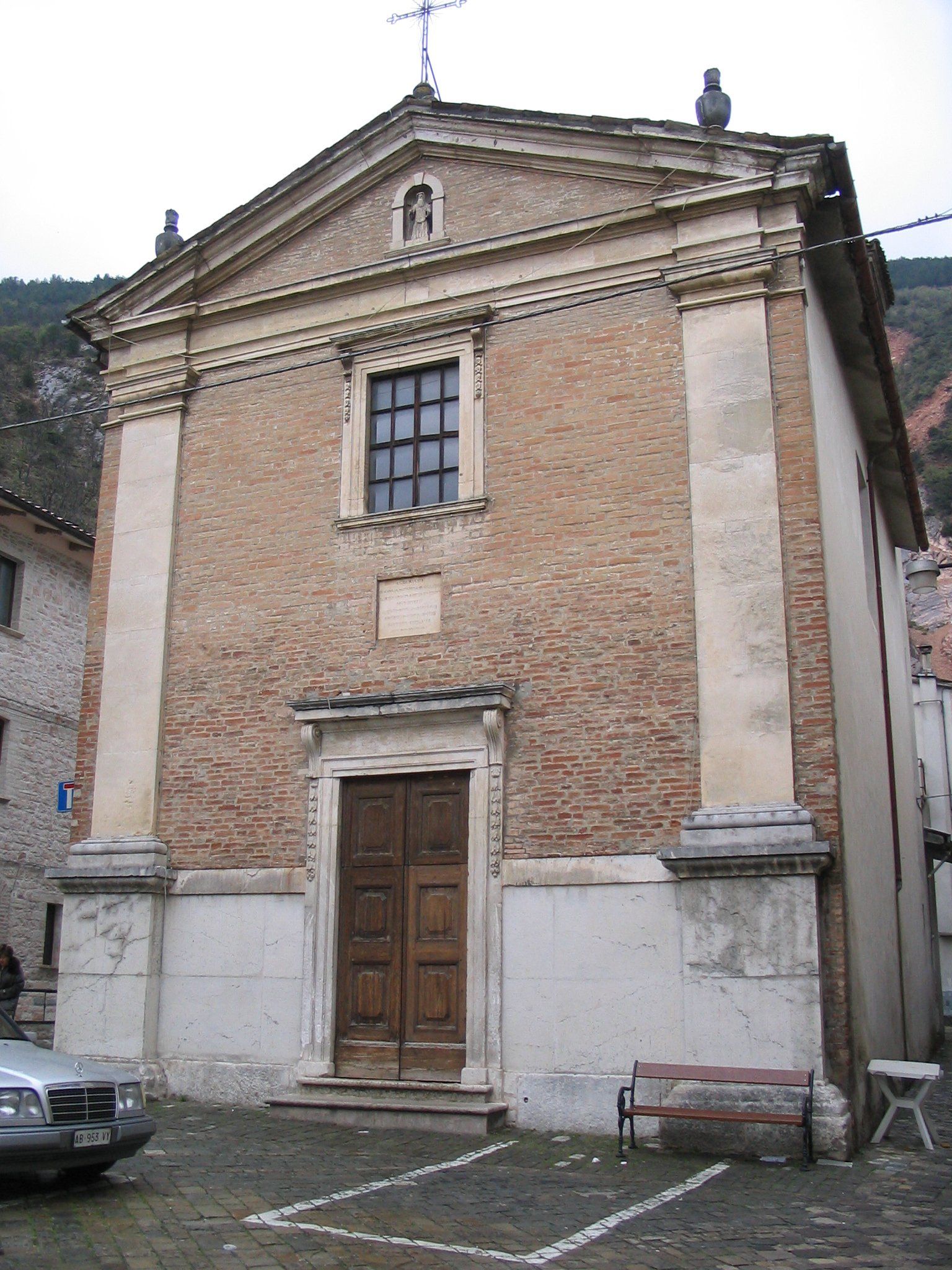 Nella piazzetta omonima della parte del centro storico posto nell’oltre Candigliano, nucleo abitativo storicamente precedente al Borgo, sorgeva l’antica chiesetta dedicata a Sant’Antonio Abate. Era stata edificata da Antonio I Brancaleoni di Monaldo nel 1375 a compimento di un voto. Il Torelli, segretario degli ultimi Brancaleoni, annota che ad un lato della porta erano incise in caratteri semigotici queste cifre: MAAALXXV T.D. GG. PP XI A.M. (1375, tempore Dni Gregori Papae XI Antonius (filius) MOnaldi). E’ la conferma della sua costruzione. Era in stile gotico ed era posizionata con l’Abside che “prolungavasi fin quasi a toccare il monte” (Montiego) e l’ingresso rivolto verso il fiume. Scrive Mons. Antonio Tarducci: “La vecchiezza, lo scarico delle macerie precipitate in occasione delle piogge, il tremuoto del 1781 la resero deforme e cadente”. Infatti nel 1784 Don Ulderico Brancaleoni, arciprete di Santo Stefano e Conte, la fece demolire e la riedificò, dandole la sistemazione attuale, offrendo così l’opportunità di prolungare quella che oggi è Via Fontanelle, a sinistra della chiesa. La nuova chiesa venne aperta al pubblico nel 1788. Nel 1841 l’Arciprete di Santo Stefano, Don Luigi Rovelli, fece eseguire i lavori di innalzamento delle pareti perimetrali. La facciata della chiesa è in stile neoclassico.